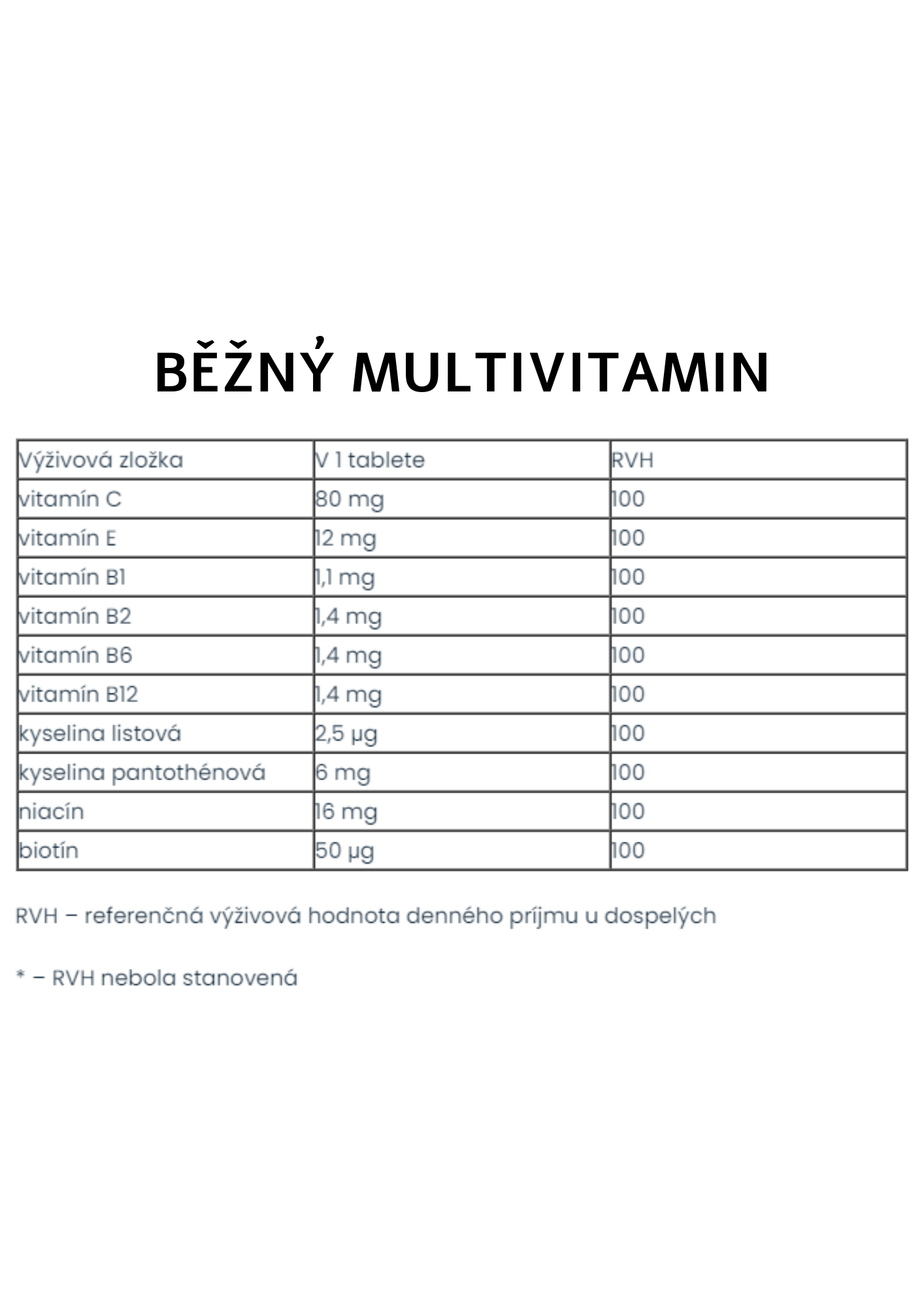 Pre predstavu môžete nižšie vidieť porovnanie zloženia bežného multivitamínu a zloženia nášho najpredávanejšieho Multivitamineralu Premium. Čísla v prvom stĺpci znamenajú obsah vitamínu a v druhom sú percentá z odporúčaného denného príjmu. Tiež počet jednotlivých zložiek je veľmi zaujímavý (10 verzus 34).
