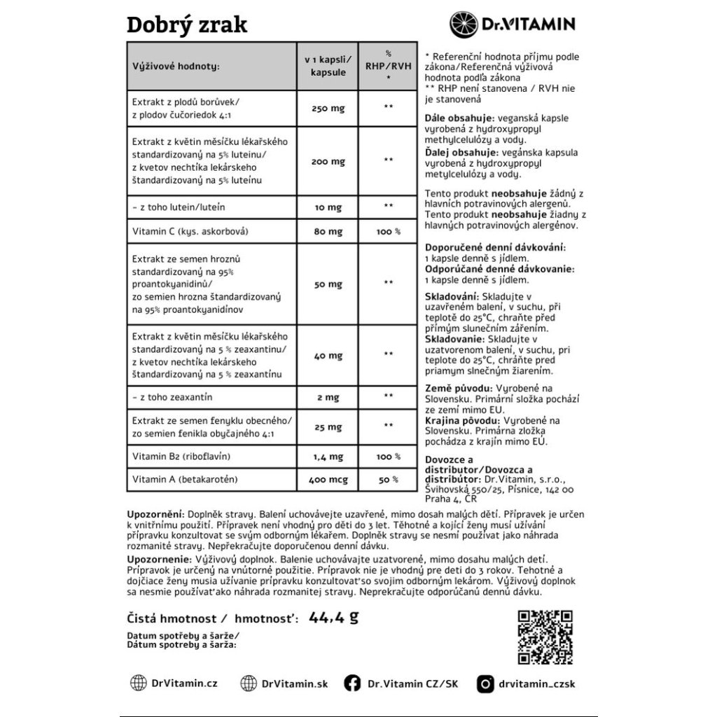 Dobrý zrak je komplexný vegánsky doplnok stravy vytvorený s cieľom podporiť zdravie očí a normálnu funkciu zraku. Obsahuje starostlivo vybrané rastlinné extrakty, karotenoidy a vitamíny, ktoré sa prirodzene vyskytujú v oku – najmä v oblasti sietnice a makuly.